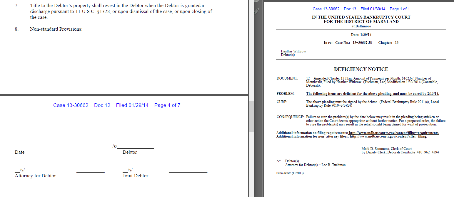 What’s relevant here is that Heather’s original Chapter 13 plan lays out the time period that this debt would be paid off in (60 months). But moreover, there’s a typo in the paperwork submitted that day. They would submit a new plan at the end of January 2014, after Heather officially married Mike. In this amended Chapter 13 plan, she forgot to sign it. February 3rd. Trustee objects to the plan, wants it amended with pay stubs for 60 days prior to the filing, wants the house surrendered. March 25th 2014. Numerous objections from the Trustee: failure to dedicate all disposable earnings in several places, failure to properly provide payments to entities owed to, failure to properly include all owners of the property the family was living at, and discrepancies in the attorney fees are just some of the errors observed in the objection. May 20th. Many of these discrepancies are still outstanding.